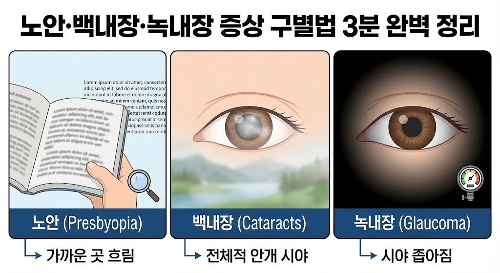 노안은 40대부터 시작되는 자연스러운 노화 현상으로 근거리 시야가 흐려지며, 백내장은 수정체가 혼탁해져 전체적으로 뿌옇게 보이고, 녹내장은 시신경 손상으로 시야 일부가 보이지 않는 암점이 생기는 것이 핵심 차이점입니다. 노안과 달리 백내장과 녹내장은 방치하면 실명까지 이를 수 있어 정확한 구분이 생명입니다.